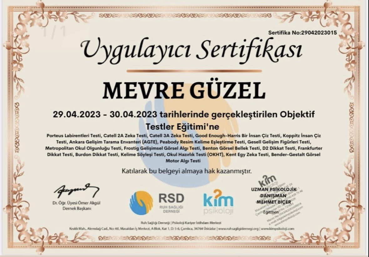 Denver II Gelişim Testi, Wısc-r Zeka Testi, Moxo dikkat Testi, Marmara İlköğretime Hazır Oluş Ölçeği, Porteus Labirentleri Testi, Catell 2A Zeka Testi, Catell 3A Zeka Testi, Good Enough-Harris Bir İnsan Çiz Testi, Koppitz İnsan Çiz Testi, Ankara Gelişim Tarama Envanteri (AGTE), Peabody Resim Kelime Eşleştirme Testi, Gesell Gelişim Figürleri Testi, Metropolitan Okul Olgunluğu Testi, Frostig Gelişimsel Görsel Algı Testi, Benton Görsel Bellek Testi, D2 Dikkat Testi, Frankfurter Dikkat Testi, Burdon Dikkat Testi, Kelime Söyleşi Testi, Okul Hazırlık Testi (OKHT), Kent Egy Zeka Testi, Bender-Gestalt Görsel Motor Algı Testi