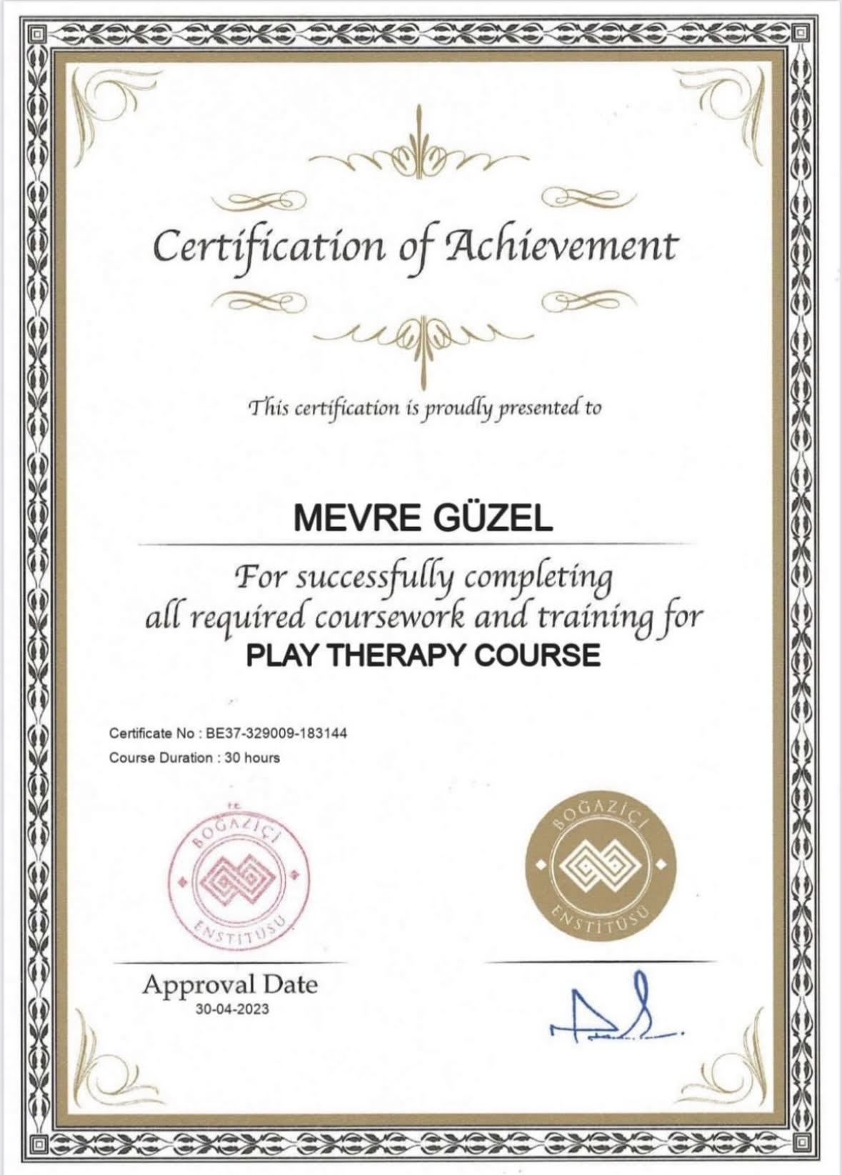 Lise; Orhan Yücel Kız Meslek Lisesi Çocuk Gelişimi ve Eğitimi, Ön Lisans; Atatürk Üniversitesi Çocuk Gelişimi, Lisans; İstanbul Üniversitesi Çocuk Gelişimi bölümünden mezun oldum. Yüksek Lisans (Master); Okan Üniversitesi Çocuk Gelişimi ve Eğitimi bölümüne devam etmekteyim.