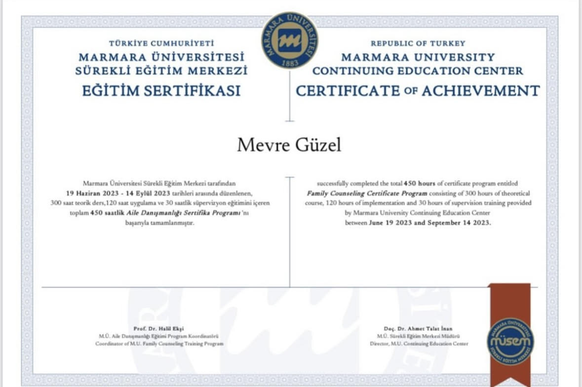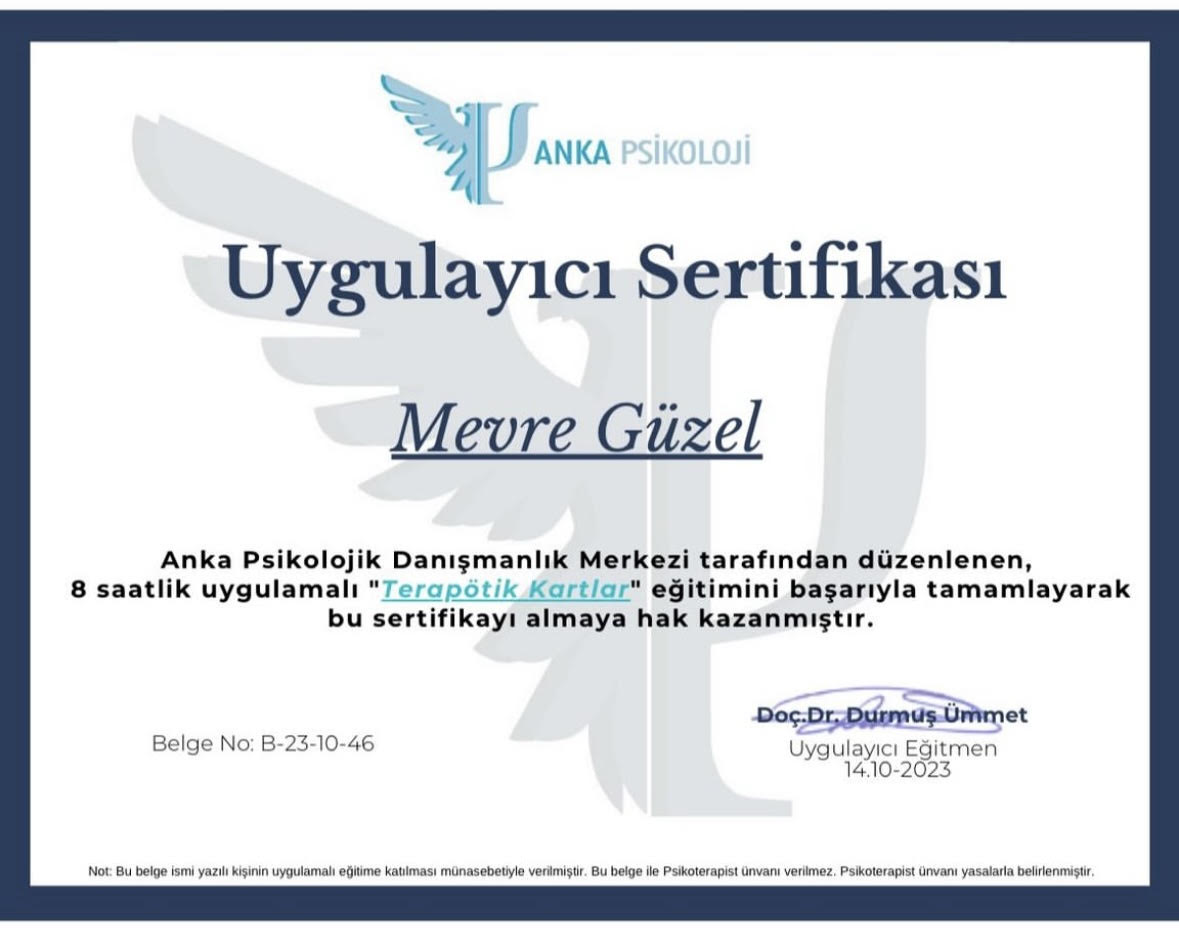 Zeynep Akıncı Danışmanlık Merkezinde Çocuk Gelişimci-Oyun Terapisti ve Aile Danışmanı olarak çalışmaktayım.